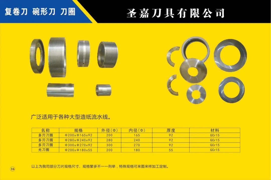 本公司所生產(chǎn)的各種型號(hào)規(guī)格分切、分條、分紙、復(fù)卷機(jī)圓刀片(蝶形上刀片、上刀架、下刀片、隔片、隔套、底棍、復(fù)卷刀、碗形刀、刀圈、大回旋圓切刀、砂輪、壓花輪、折疊刀、齒刀、異形刀)橫切刀、裁切刀、熱切刀、粉碎刀、切粒刀、撕碎刀、折頁(yè)刀、開(kāi)槽刀、油墨刮刀、切臺(tái)圓刀、三孔刀、切管刀、氣壓刀組、剪切刀組、熱切刀組廣泛適用于造紙、紙制品加工、膠粘帶制品、薄膜、電線電纜、橡膠、輪胎、鋁箔、化纖、非織造布、復(fù)合包裝、卷煙、皮革、印刷、服飾輔料等行業(yè)。