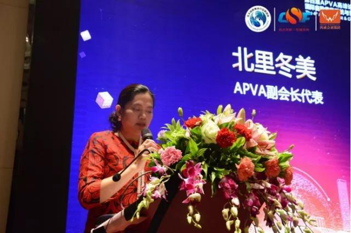 APVA副會長代表北里冬美致辭:分析了目前自助售貨與新零售的新形態(tài)現(xiàn)況,并希望在亞太自助售貨行業(yè)聯(lián)合會于會長的領(lǐng)導(dǎo)下行業(yè)更規(guī)范,資源更融合,發(fā)展更穩(wěn)健,并預(yù)祝2018中國(廣州)國際自助售貨系統(tǒng)與設(shè)施博覽交易會圓滿成功。