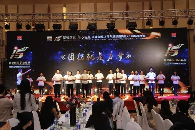 鴻威集團(tuán)15周年感恩盛典暨2018感恩大會(huì)已進(jìn)入尾聲,鴻威集團(tuán)全體員工一同上臺(tái)謝幕合影。