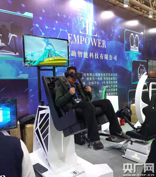 圖為:一名觀眾正在體驗(yàn)參展商展出的VR游戲 央廣網(wǎng)記者張卓 攝
